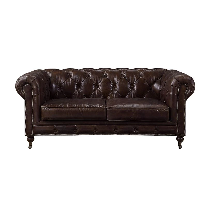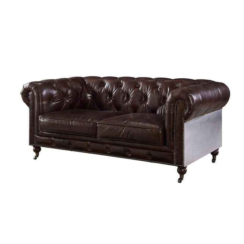 - OverviewWith details such as rolled arms and button-tufted backrest, the Aberdeen Living Room Collection by Acme Furniture has a classic Chesterfield design that never goes out of style. Upholstered with top-grain leather in a rich vintage brown contrasts beautifully against the lustrous aluminum back.