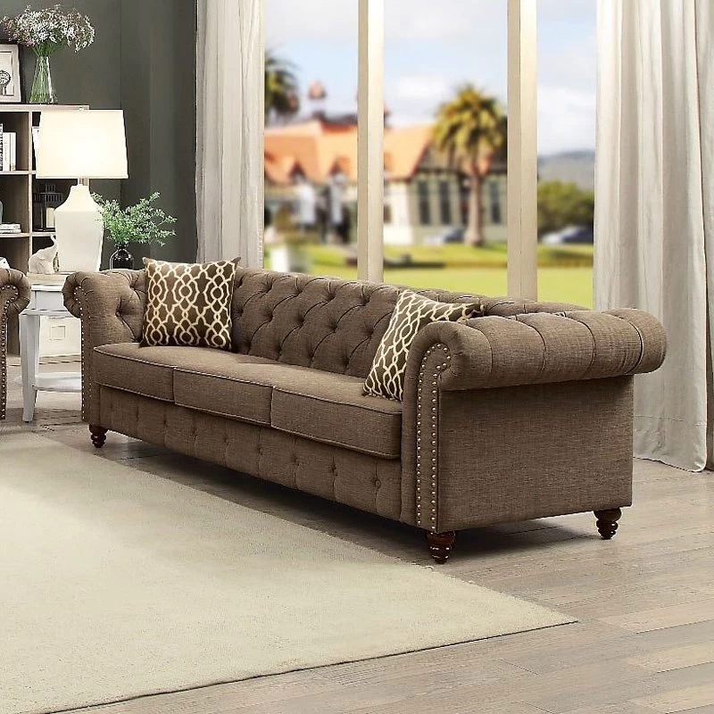- OverviewAurelia Living Room Collection by Acme Furniture upholstered in brown color linen fabric. Comfort and style define this collection. This collection is detailed with classic details like deep button tufts and plush, sheltering arms. Adorned with button tufting and rolled arms with backs, and included accent pillows, wood frame, and wooden turned-bun legs. And the beautiful look is perfect for any room environment.