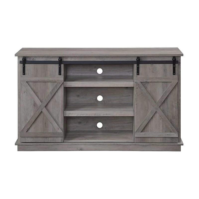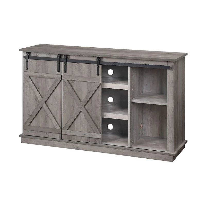 - OverviewHighlight your living room with a down-to-earth aesthetic! The Bellona TV Stand by Acme Furniture features a rustic casegood and two sliding barn doors with an X brace design. The sturdy metal track is paired with smooth sliding rollers, making you could easily move the barn doors to cover any storage spaces. There are four storage rooms and three media compartments with back holes for cable management that are perfect for your audio-visual equipment.