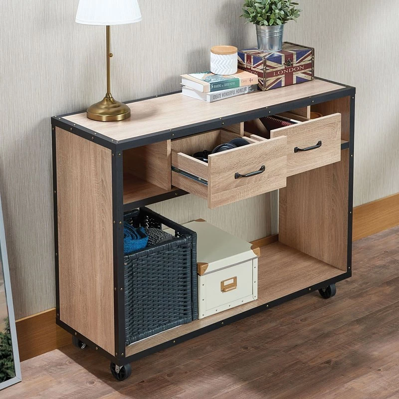 - OverviewThe Bemis Console Table by Acme Furniture offers plenty of storage function and mobility for your home. Feel good knowing you have a place to put your often read books, remotes and other items, a durable look with it’s all around riveted angle metal accent around light weathered oak and casters wheels for easy moving.