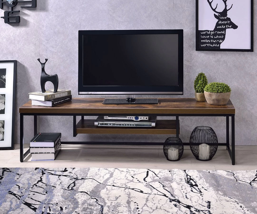 - OverviewThe Bob TV Stand by Acme Furniture simply states that you are up with the times, with its industrial looks and the mixing of black metal with weathered oak. The thicker wood top is supported by lighter scaled black metal lags and a stretcher which assures for a sturdy surface. A design sure to last for many years, it will create a perfect space in your home.
