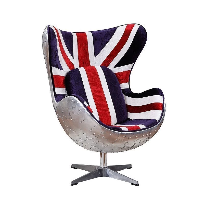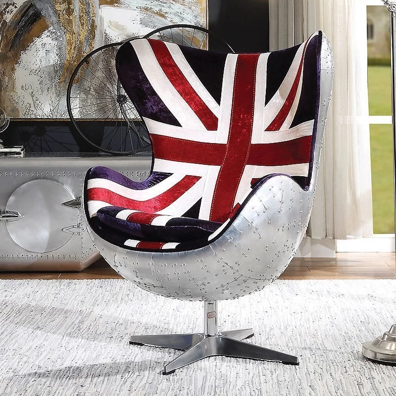 - OverviewThe bold, curved design and stitched detail in the England flag pattern upholstery gives the Brancaster Balloon Swivel Accent Chair by Acme Furniture a stand-out sense of style. Crafted from metal with an aluminum finish, the frame is durable and refreshingly modern. With its swivel feature, the balloon chair lets you reach everything you need while remaining reclined in comfort.