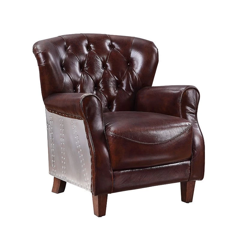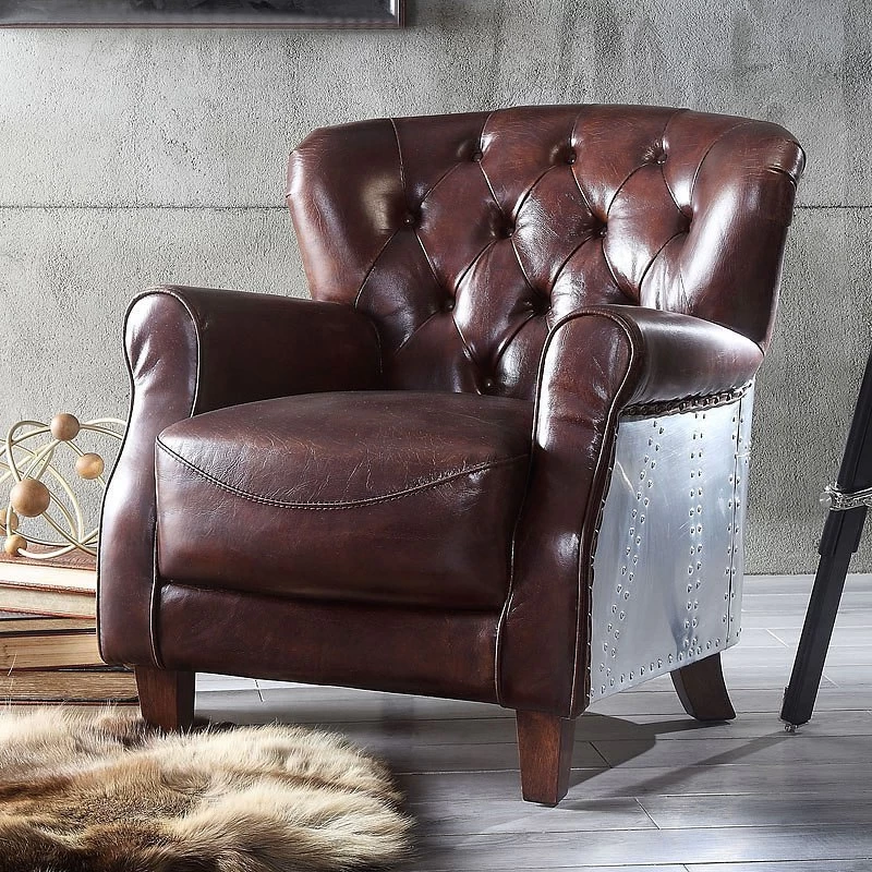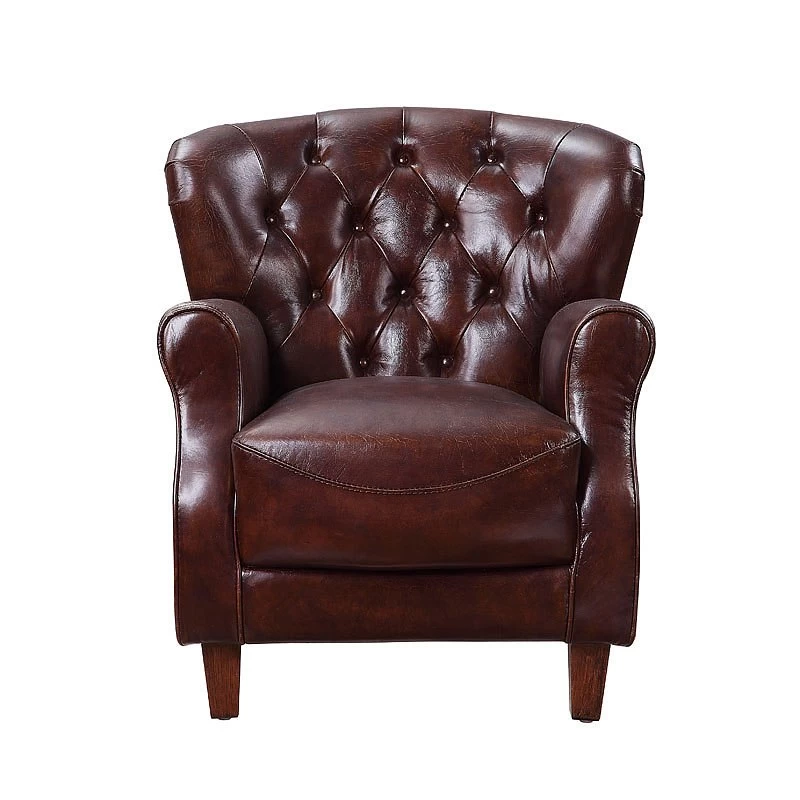 - OverviewThe Brancaster Club Chair by Acme Furniture invites you to sit back and relax for hours on end. A timeless design, this armchair features vintage brown top grain leather upholstery with button-tufted accents, rolled arms, and tapered wood legs. Whether your decor leans traditional or transitional, or even modern eclectic, the tasteful style of this unusual piece will be perfect for any room.