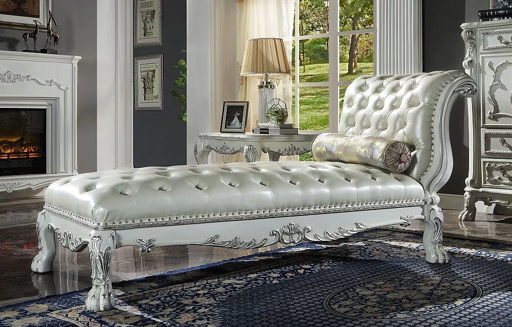 - OverviewAdd old world charm in your home with the Dresden Chaise Lounge by Acme Furniture. It takes inspiration from a Victorian Era fainting couch with its immaculate features. The bone white finish and PU upholstery compliment the beautiful moldings. The moldings have hand-brushed silver accents to really make them pop. Crystal-like button tufting adds a regal touch.