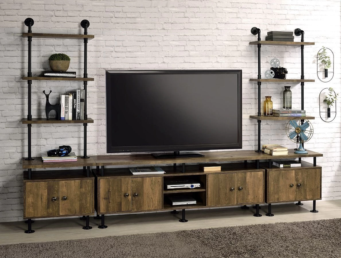- OverviewSleek and industrial pipe work make up the Ensata II Entertainment Wall by Acme Furniture. The side piers feature three shelves that can be used for displaying home decor goods and two doors with a closed storage compartment for keeping clutter out of sight. Complete the look with the matching TV stand, the TV stand provides storage solutions for your gaming consoles and entertainment systems. The rustic oak and black finish will help you create the perfect industrial aesthetic in your home.