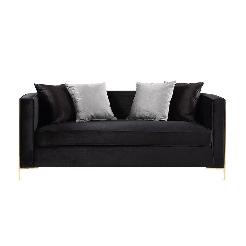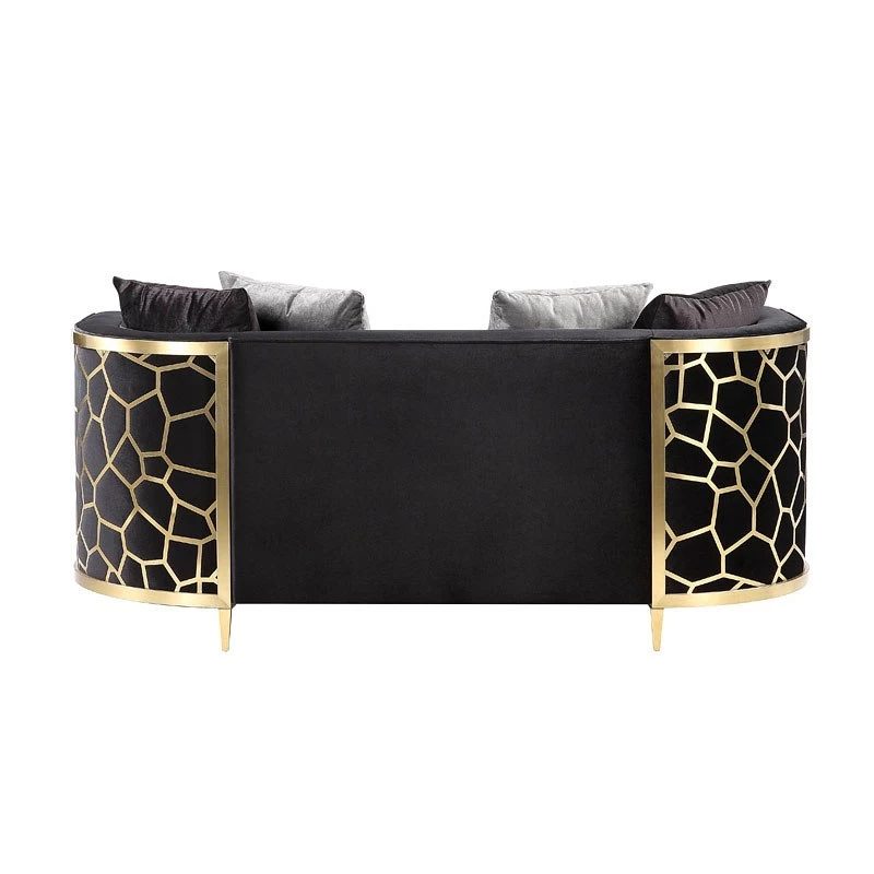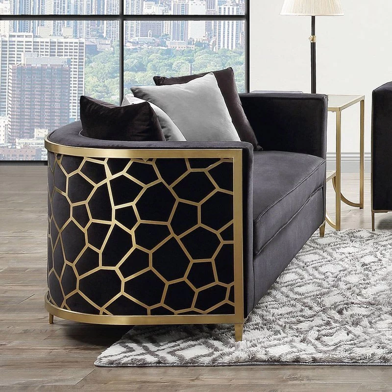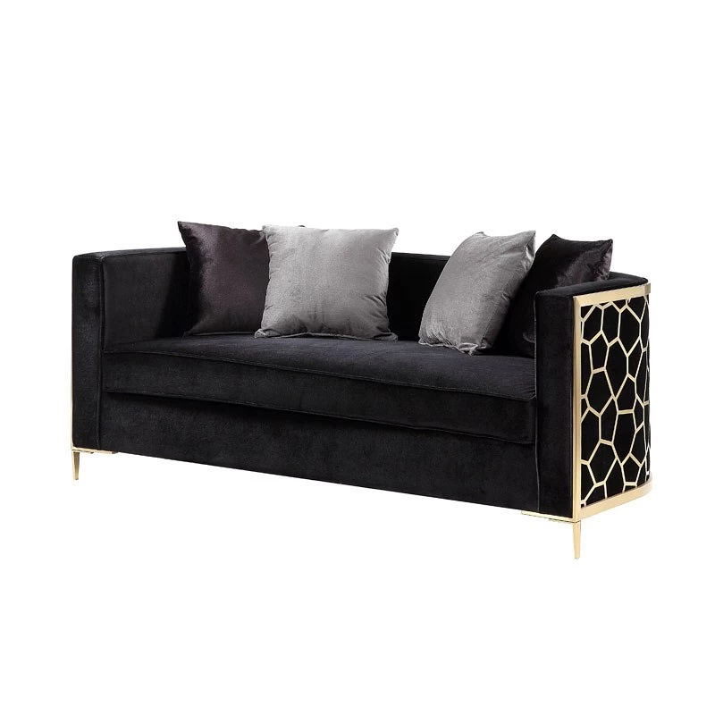 - OverviewWith an impressive metal gold base and eye-catching geometric patterned sides merged with a traditional tuxedo design, the Fergal Living Room Collection by Acme Furniture is sure to impress everyone. The luxurious black velvet upholstery makes the gold accents pop; initiating them as the focal point of your living space. The wooden inner frame makes for durable construction, while the seats provide hours of comfort. Leave your guests impressed with the Fergal collection.