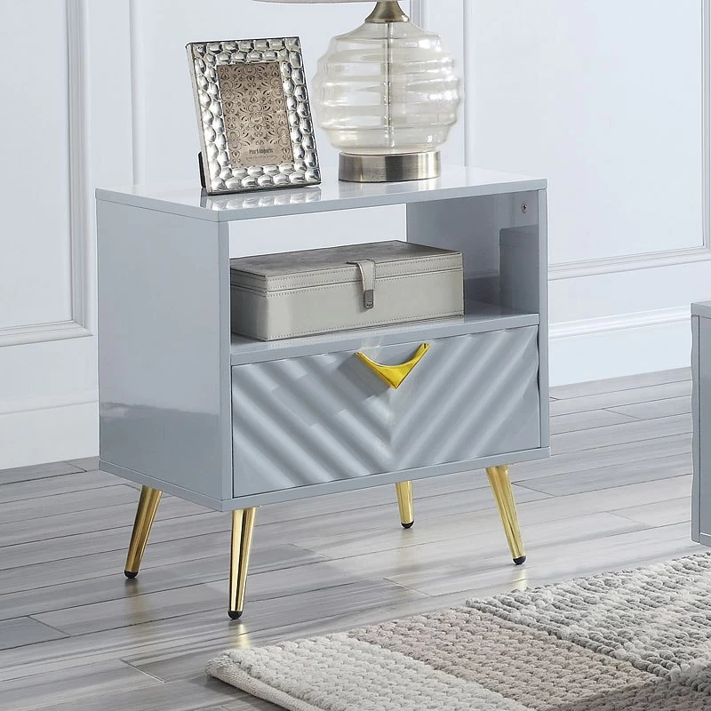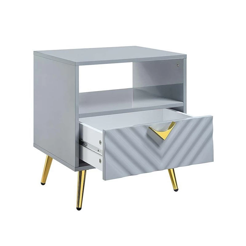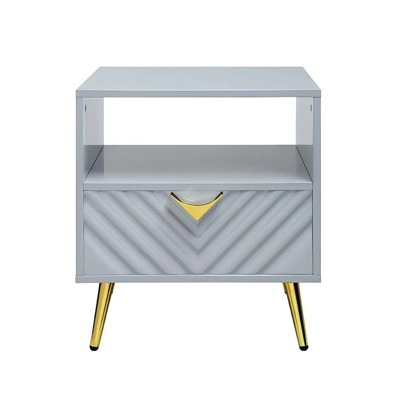 - OverviewThe Gaines Occasional Table Collection by Acme Furniture is a glamorous and sophisticated grouping that adds a chic style to any room. The gray gloss finish and gold metal accents help to accentuate the clean lines of the pieces and add a pop of glamour. The diagonal line design adds visual interest and texture, making each piece stylish.