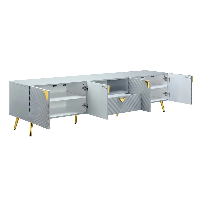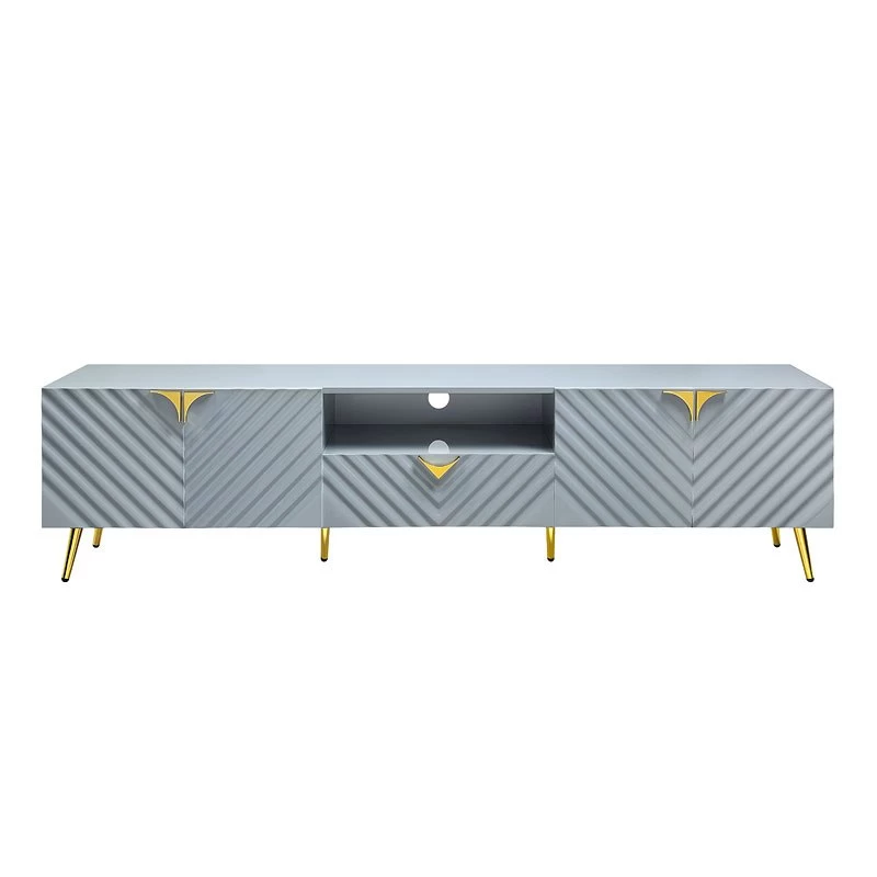 - OverviewThe Gaines Entertainment Collection by Acme Furniture is a glamorous and sophisticated grouping that adds a chic style to any room. The gray gloss finish and gold metal accents help to accentuate the clean lines of the pieces and add a pop of glamour. The diagonal line design adds visual interest and texture, making each piece stylish.