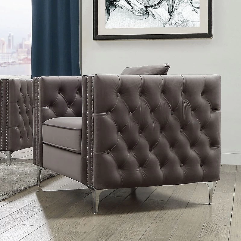 - OverviewElegant and eye-catching, the stunning Gillian II Living Room Collection by Acme Furniture is the perfect addition to any space. Rich dark gray velvet covers the plush. The comfortable seat was padded with high-density foam and has modern tufted design on the back and sides. Strength and beauty is guaranteed with a wood frame and sliver stainless steel legs. The nail heads that outline the front edge of these beautiful pieces add an extra element of elegance.