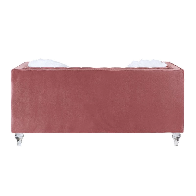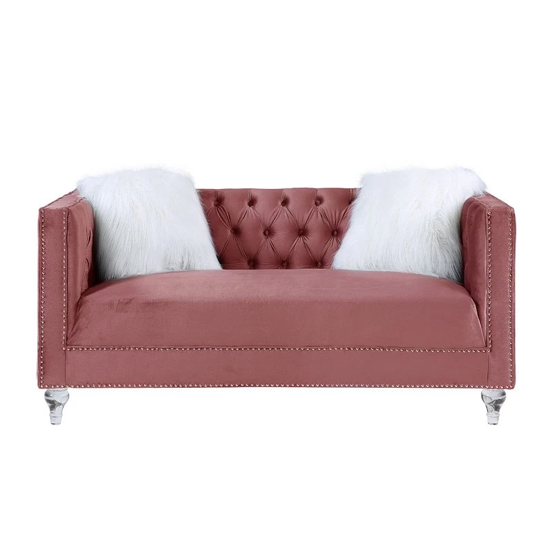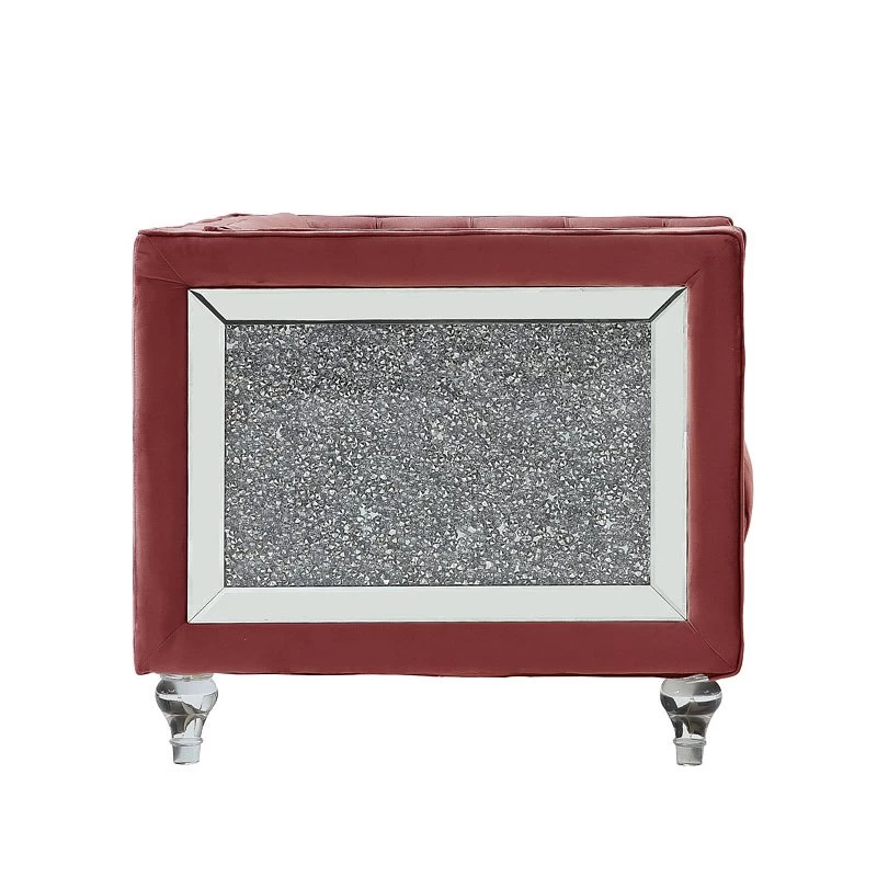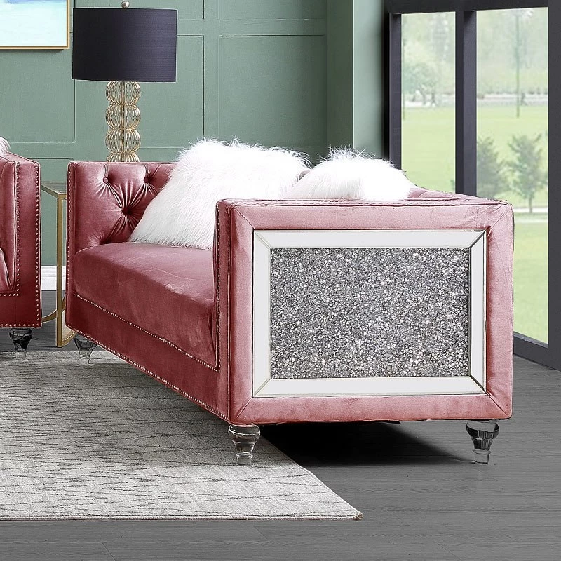- OverviewImpressive and bold, the Heiberoll Living Room Collection by Acme Furniture is sure to impress your guests. The collection includes mirrored side trim with faux diamonds to add a glimmering touch. The whimsical acrylic turned legs give off the illusion that the pieces are floating. The collection is upholstered in a plush velvet that feels silken to the touch. Ultra-comfortable seats and a sturdy wooden inner frame make this piece a joy to lounge on. Classic nailhead trim and button tufting finish off this glamorous collection.