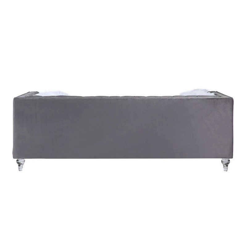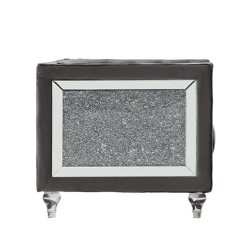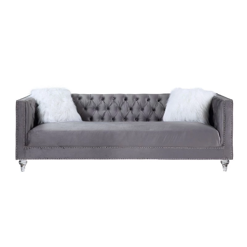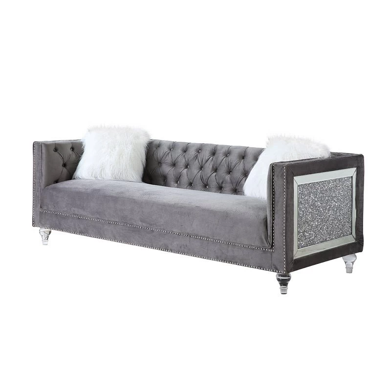 - OverviewImpressive and bold, the Heiberoll Living Room Collection by Acme Furniture is sure to impress your guests. The collection includes mirrored side trim with faux diamonds to add a glimmering touch. The whimsical acrylic turned legs give off the illusion that the pieces are floating. The collection is upholstered in a plush velvet that feels silken to the touch. Ultra-comfortable seats and a sturdy wooden inner frame make this piece a joy to lounge on. Classic nailhead trim and button tufting finish off this glamorous collection.