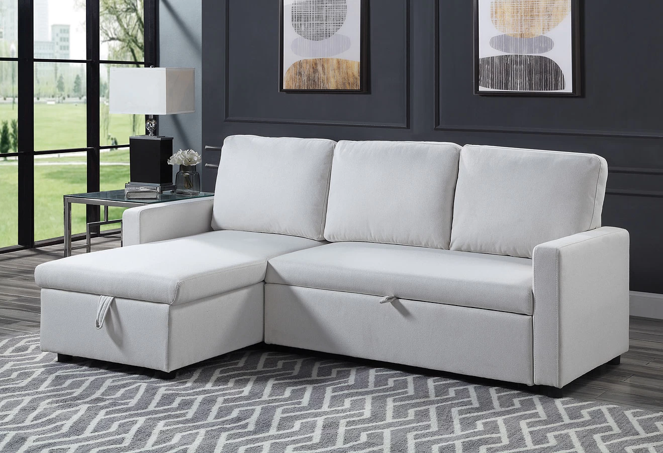 - OverviewDon’t let having a smaller space deter you from having a sectional. The Hiltons Sleeper Sectional by Acme Furniture serves as a sofa with the bonus of a reversible storage chaise. The storage chaise can help minimize clutter and keep your space tidy. To add more function to the piece it easily transforms into a sleeper for those unexpected overnight guests.