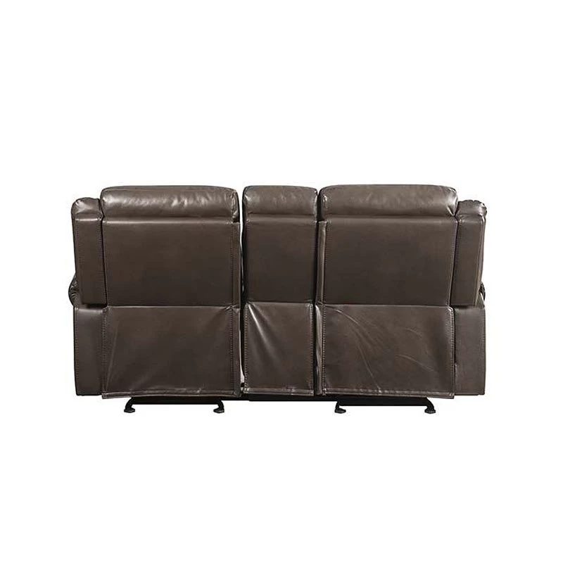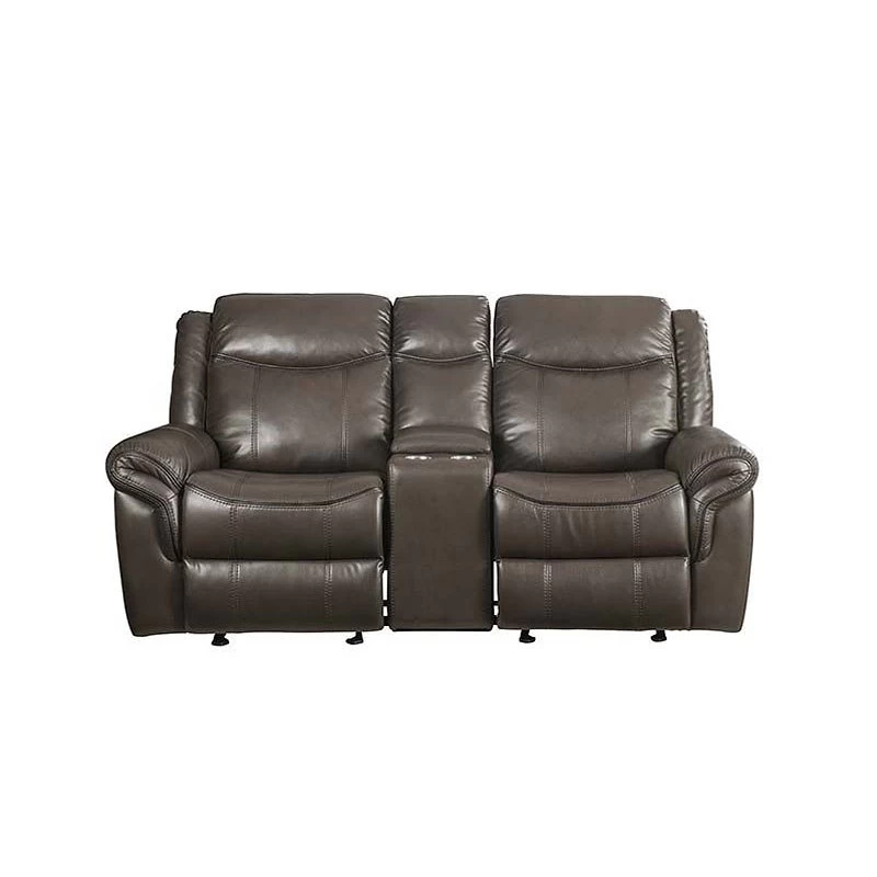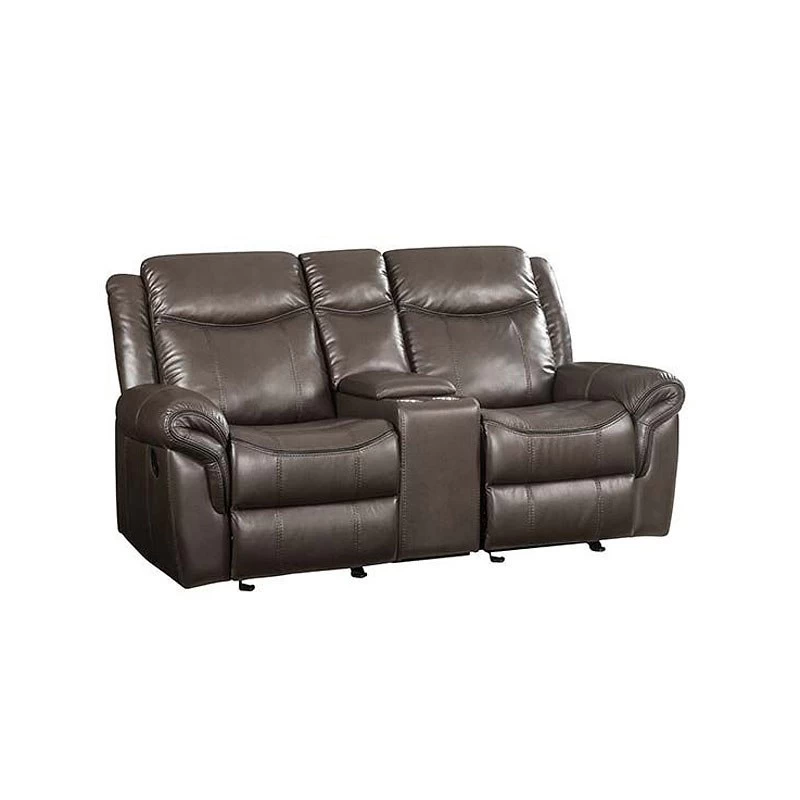 - OverviewCuddle up in this decadently plush Lydia Living Room Collection by Acme Furniture. The collection is upholstered in a warm and earthy brown leather-aire. Distinctive elements include wrap-around padded armrests, along with a few hidden surprises. The loveseat includes a center console that also features cup holders and AC power and USB ports.