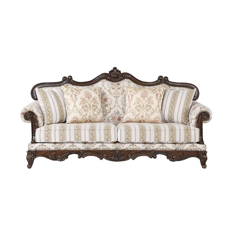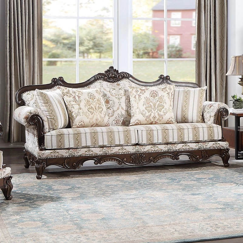 - OverviewVictorian antique design without the musty moth odor, this design offers unparalleled evocative refinement. The beautiful Nyla Living Room Collection is great for creating an inviting classic home by Acme Furniture. Wooden carvings decorate the crown and apron. The rolled arms and more of that vintage charm add provide plush comfort. The floral fabric upholstery and striped seats further enhance the appeal. The assorted patterned throw pillows are included.