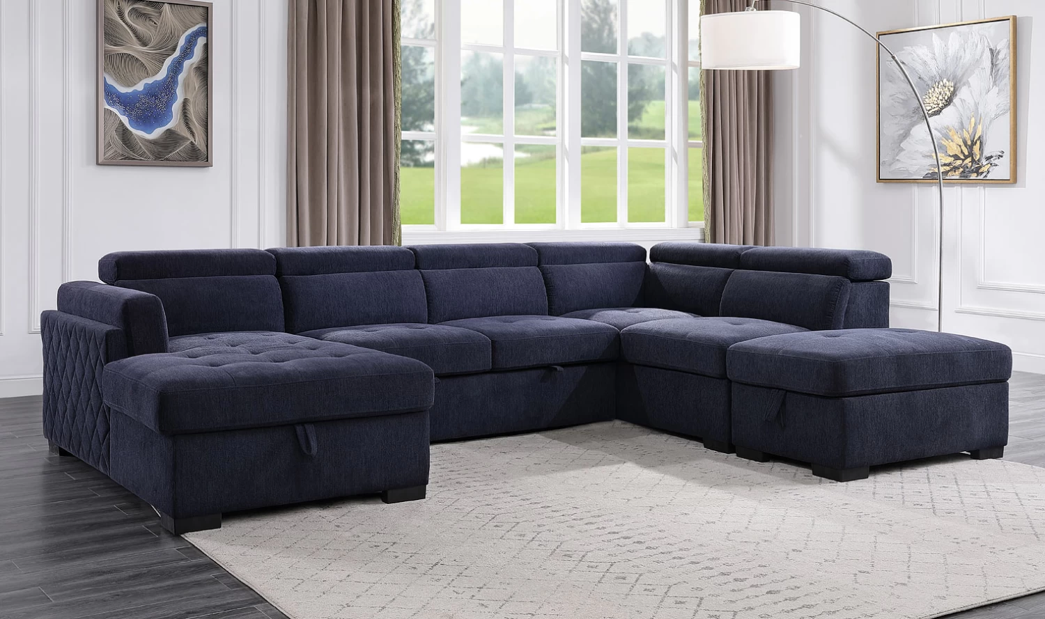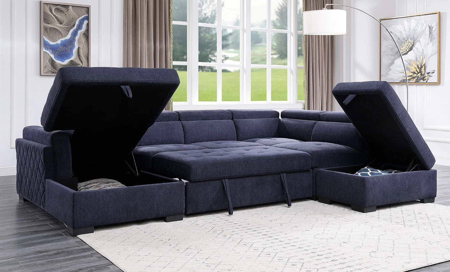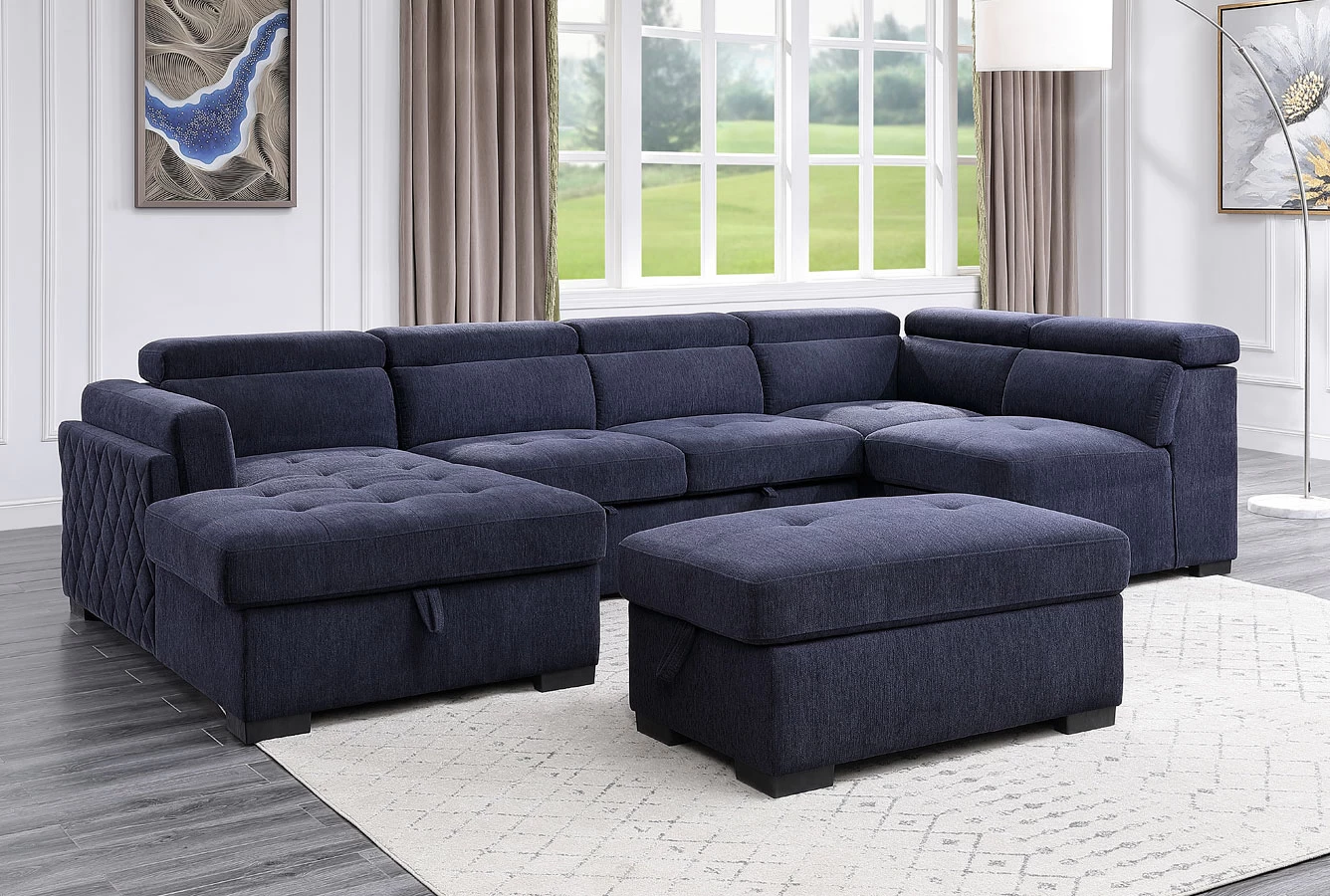- OverviewSpend more time with your family on this Nekoda Storage Sleeper Sofa Sectional w/ Ottoman by Acme Furniture. This sofa features adjustable headrests that help elevate the comfort level. Family movie nights are about to be more pleasant with the pull-out bed feature on the loveseat. The button-tufted seat cushions give it a refined look. The chaise and ottoman offer storage to keep blankets and pillows nearby at all times. The navy blue color adds a touch of calmness and serenity. Big enough for the entire family with all the comfort and storage options needed.