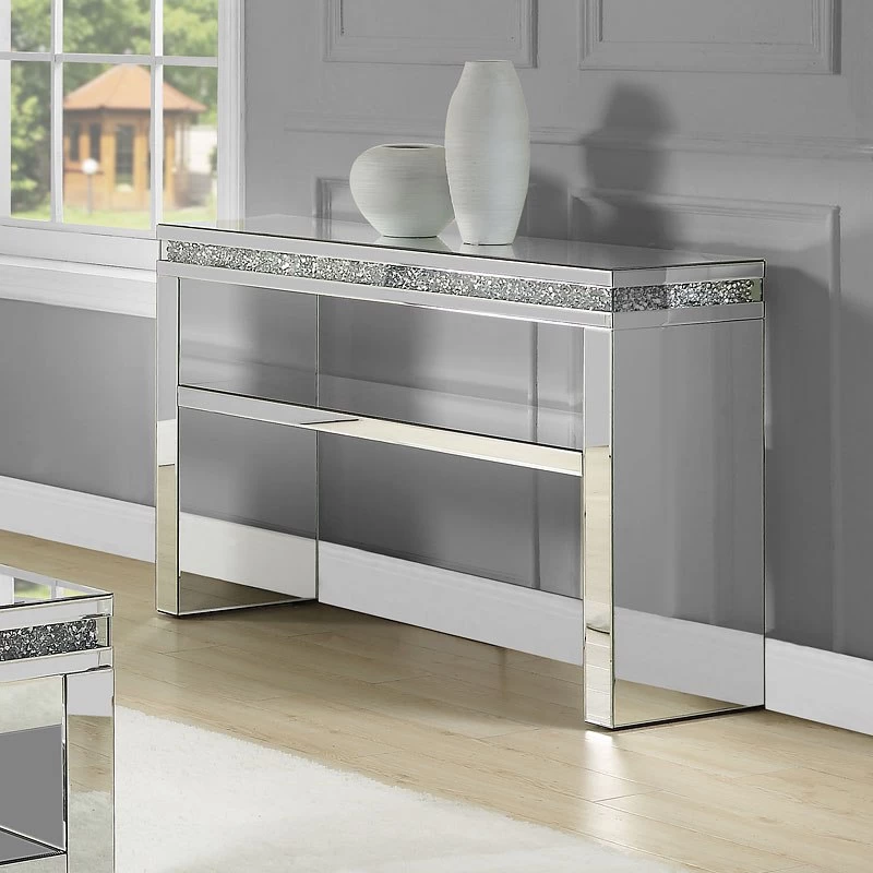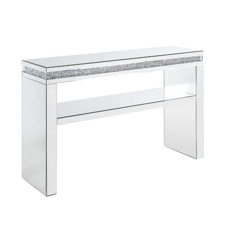 - OverviewA chic sidekick for your sofa, this glamorous Noralie End Table by Acme Furniture provides the perfect space to spread your magazines after a long day. Scatter light throughout your living space with its faux diamonds inlay and gleaming mirrored finish. A standout on its own or accentuated with your decor. Featuring a multipurpose lower shelf for all your storage needs. The Noralie End Table will make your collection shine and reflect your sense of style.