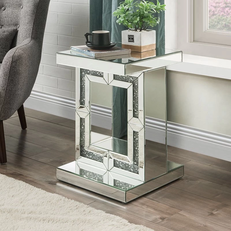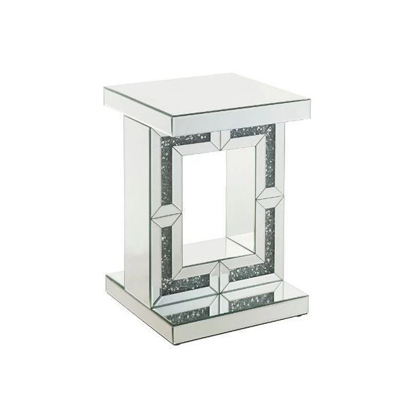 - OverviewBrighten up your space with this mirrored and faux diamonds Noralie Accent Table by Acme Furniture. With its unique pedestal base, this table is one your friends and family will all be envious of and will be talking about for years to come. The faux diamond inlay adds the right amount of texture and will reflect light magically. Glam meets function with its ample tabletop. You will be able to store and display all your goods.