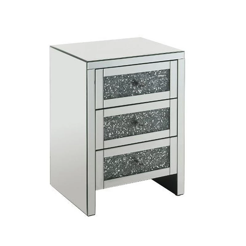 - OverviewThe Noralie Accent Table by Acme Furniture will give any room a touch of glamour. Mirror and glass materials give it a modern and clear touch while faux diamond inlays add glam style to this piece. Use this unique piece as the perfect accent for any room decor. It has three storage drawers with self closure and a safety stop, providing ample and convenient storage for small electronics, cosmetics, accent items, jewelry, and more.