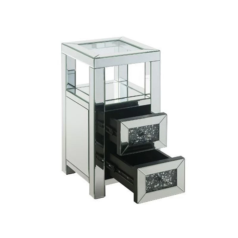 - OverviewThe modern glamour of the Noralie Accent Table by Acme Furniture will brighten your foyer or bedroom. This brilliant accent table features a mirrored finish and a clear tempered glass top, adding dimension, contrast, and shine to this functional piece. It has two drawers with spectacular faux diamond inlays that add the right amount of texture while a tier shelf under the top provides more storage space to suit your needs.