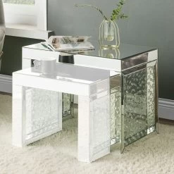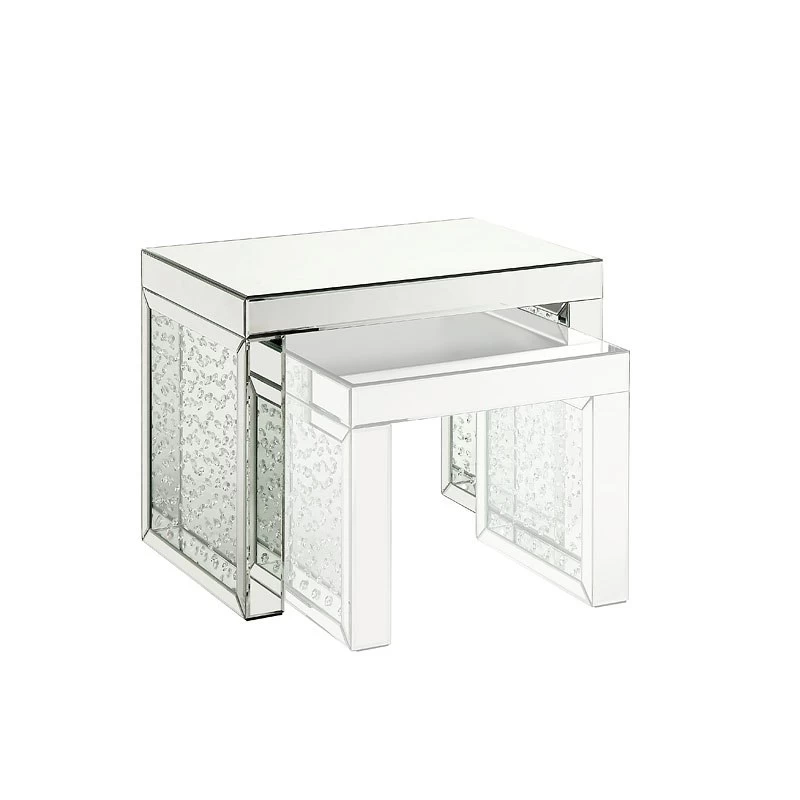 - OverviewGo full glam with this Nysa Accent Table by Acme Furniture. The brilliant mirrored tabletop and glistening faux crystals inlay will reflect light and make any room appear larger. It provides a spacious tabletop ample enough for displaying various decor items while the sled base gives the table stylish and sturdy support. Use in any room to enhance your decor. The Nysa Accent Table is truly a statement piece for any space.