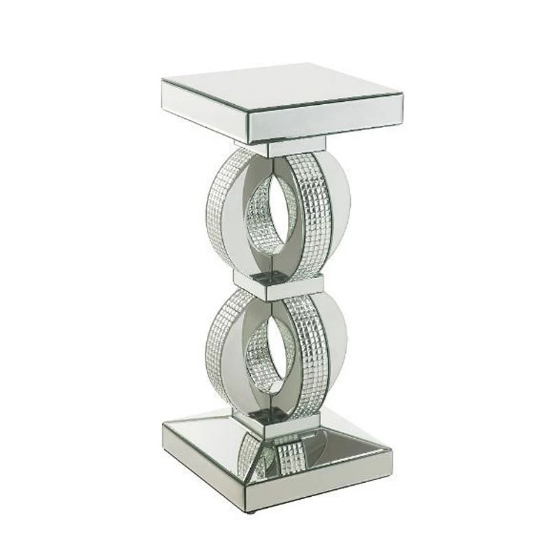 - OverviewMake a striking statement in your home with this Ornat Accent Table by Acme Furniture. Featuring mirrored frame with faux diamond inlay, it creates a bold, yet elegant textured look. Classic pedestal base gives it elegant support, with spectacular faux diamonds inlay adding modern glamour to this piece. Contemporary yet beautifully crafted, this accent table will sure to be a great addition to your space.