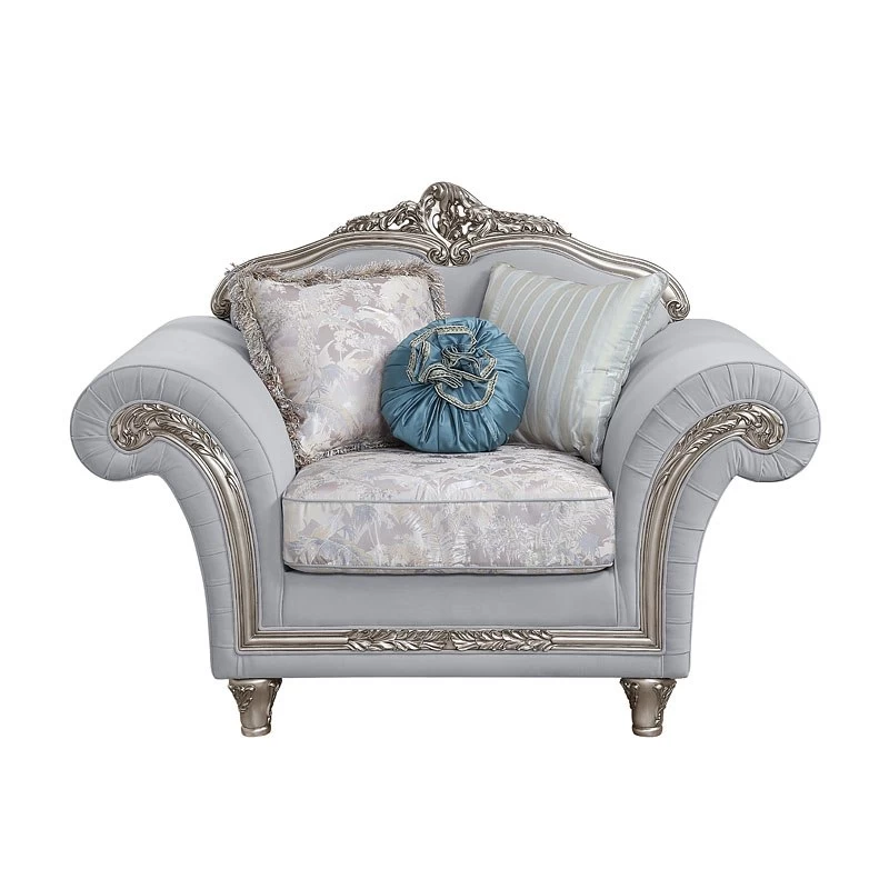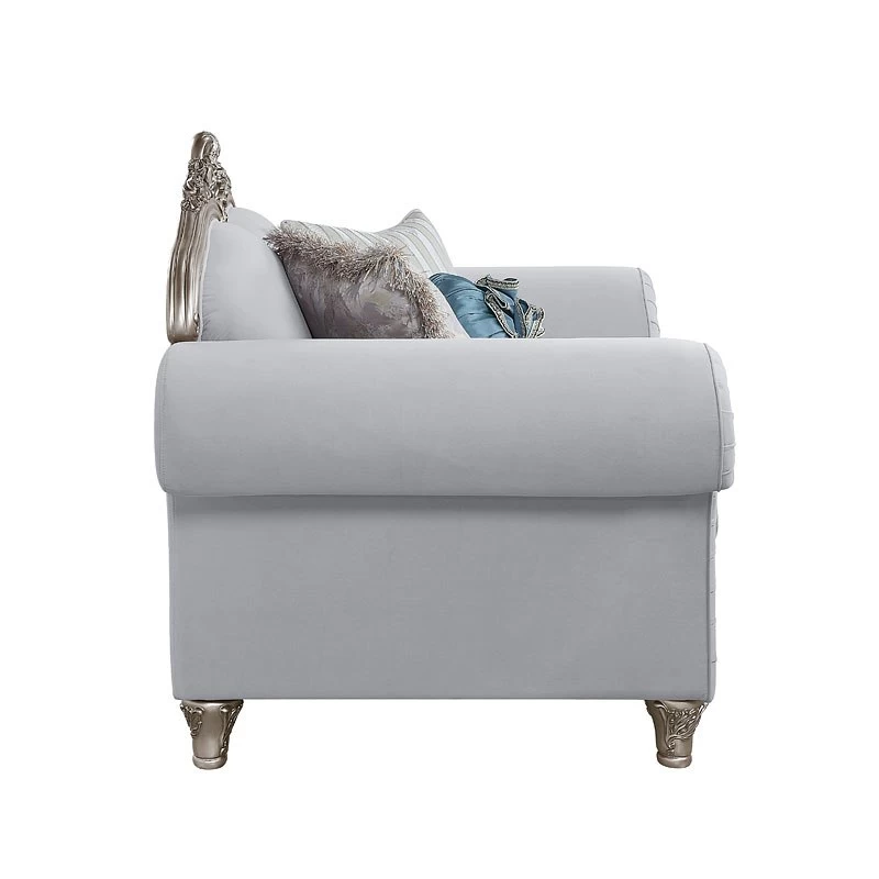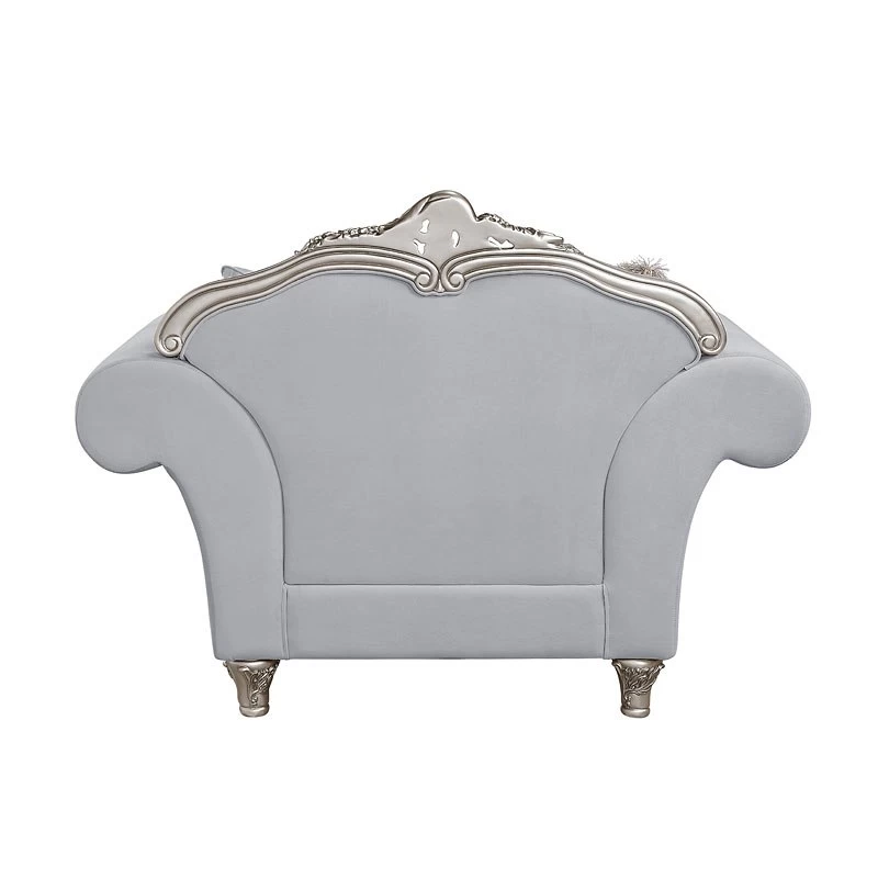 - OverviewCreate a more luxurious and comfortable living room with this classic Pelumi Living Room Collection by Acme Furniture. This collection features a wooden design with platinum wooden trimmings. The Pelumi comes with pocket coil seating for comfort. The back is cushioned and designed with a camelback silhouette. Upholstered in light gray linen fabric for an airy touch. The rolled arms and tapered legs give this collection an antique look.