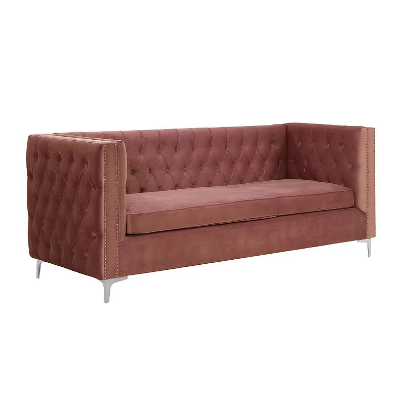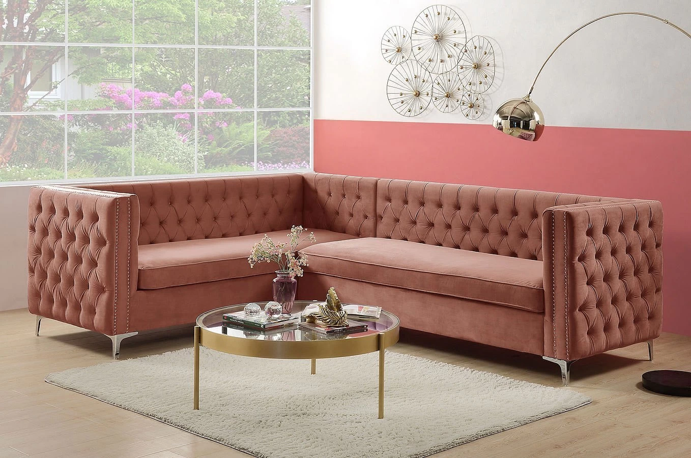 - OverviewFrankly, the Rhett Sectional by Acme Furniture is simply stunning. Vibrant velvet upholstery pops against a boxy silhouette. Button tufting extends around the inside and outside of high shelter armrests as well as both sides of the tight seatback. Metal bracket legs and nail head trim add some shine to of this “L” shaped sectional.