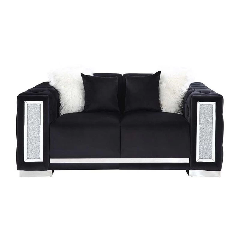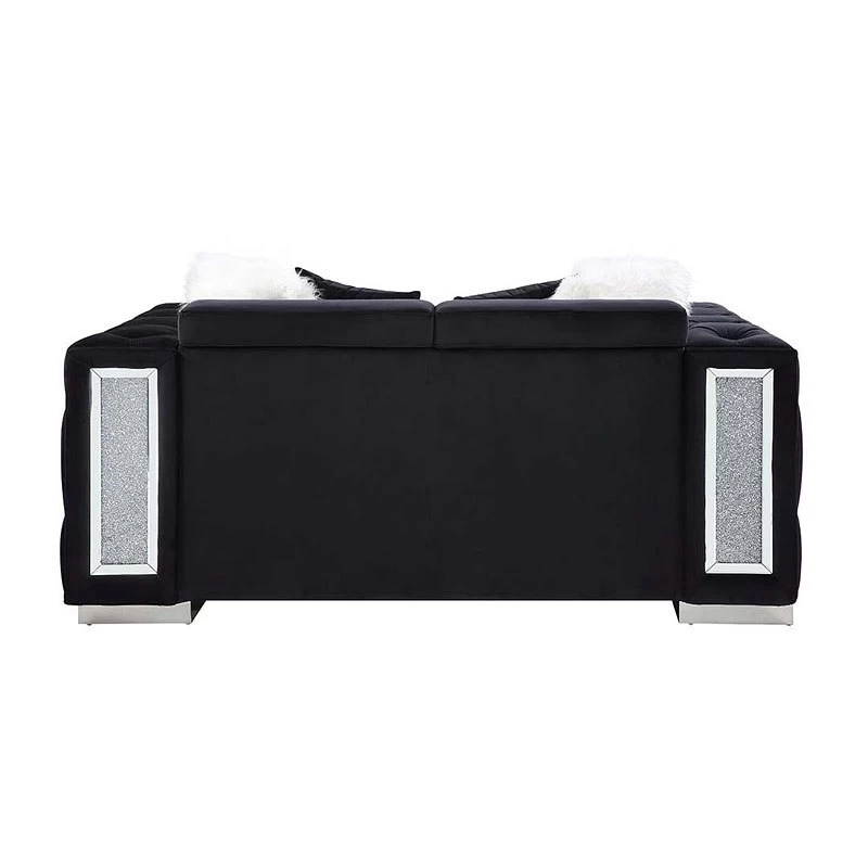- OverviewCenter your living room around utmost sophistication and exquisite style with this Trislar Living Room Collection by Acme Furniture. The collection offers your interior space eye-catching appeal with its button-tufting details and mirrored trim accent. In a buttery soft black velvet upholstery to add richness and perfect modern glam addition for any room. With sleek chrome legs, this collection not only adds refined elegance but also provides ultimate tranquility.