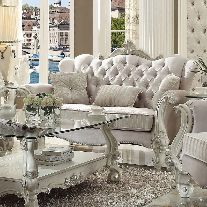 - OverviewThe Versailles Living Room Collection by Acme Furniture will create you an elegant, warm and the traditional taste in your living room. The collection reflects highly decorative base with scrolled feet, and the upholstered seats with the deep button tufted and nail head trim accents add classic character and represents luxurious detailing. The collection is your perfect choice for your living room.
